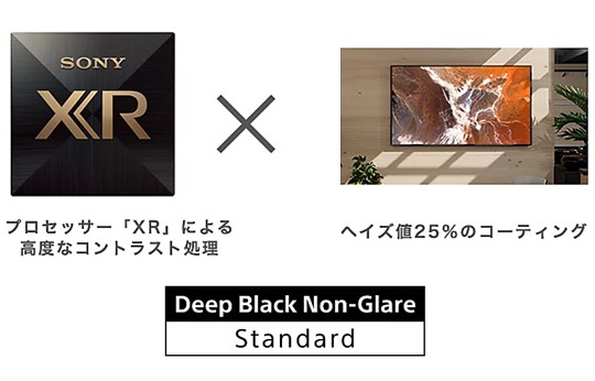 「ディープブラック・ノングレア スタンダード」はプロセッサー「XR」による高度なコントラスト処理と25%という高いヘイズ値(*)のコーティングを組み合わせることにより映り込み大幅に抑えながら、コントラストの高い高画質を実現するソニー独自の技術です。明るい会議室やロビー、店舗など、強い照明や外光が差し込むコンテンツ本来の色味が再現しづらい場所でも見せたい映像をはっきりと鮮やかに表示することができます。