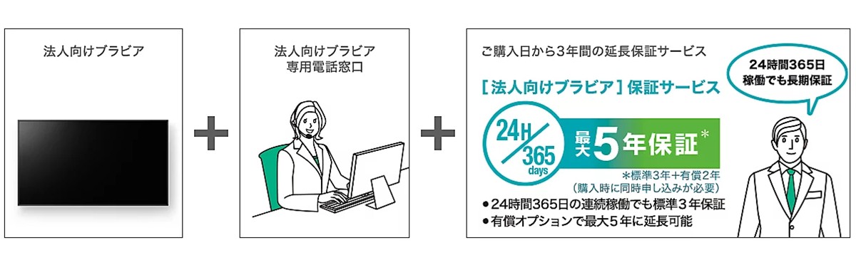 ビジネスに長く貢献し続けるため、法人向けブラビアは導入後の安心も重要視しています。24時間365日の連続稼働でも対象となる3年保証を標準付帯。さらに、有償オプションで保証期間を5年(*)に延長可能です。また民生用モデルとは別に、法人向け専用のサポート窓口を設置。お問い合わせや修理相談も専門オペレーターが迅速に対応します。万が一製品が故障した際には、お客様のもとへ修理エンジニアを派遣。出張訪問での修理対応で業務をサポートします。ソニーでは、商品の販売から修理までを一元的にオペレーション。質の高いお客様対応を提供します。