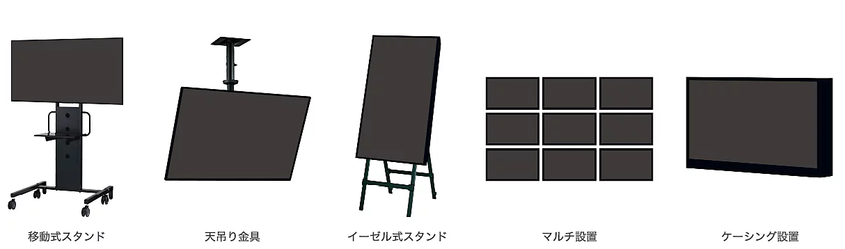 薄型・軽量・狭額縁が特徴的なシンプルデザインの筐体は、横置きはもちろん、縦置き・傾斜設置も可能。加えて、狭い会議室などでスペースを有効活用できる移動式スタンドや、サイネージ効果を高める天吊り金具にも対応しています。イーゼル式スタンドや、マルチ設置・ケーシング設置などの特殊設置にも対応しており、幅広い用途や設置場所にお使いいただけます。