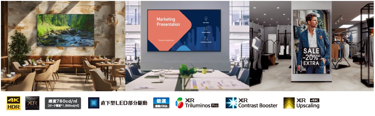 「ディープブラック・ノングレアコーティング」を採用したことで、47%というヘイズ値で映り込みを大幅に抑制しながら、認知特性プロセッサー「XR」とピーク輝度1,500cd/m2(*)の直下型LED部分駆動パネルによる高コントラストな映像表現を実現しました。広大な空間でも際立つ98V型大画面で、大会議場だけでなく受付ロビーやショールームなどの外光や照明の強い場所でも、映り込みを抑えながら精細かつ華やかな映像で空間を彩ります。