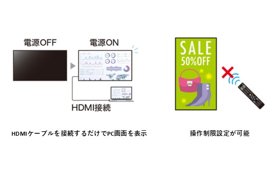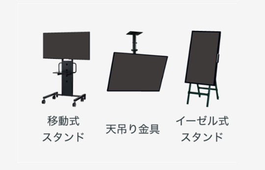 薄型・軽量・狭額縁の筐体は、横置きはもちろん、縦置きや天吊り、傾斜設置も可能です。移動式の壁寄せスタンドで狭い会議室を有効に使ったり、目を引くイーゼル型スタンドで店頭でのサイネージ効果を高めるなど、幅広い用途や設置場所にフィットします。