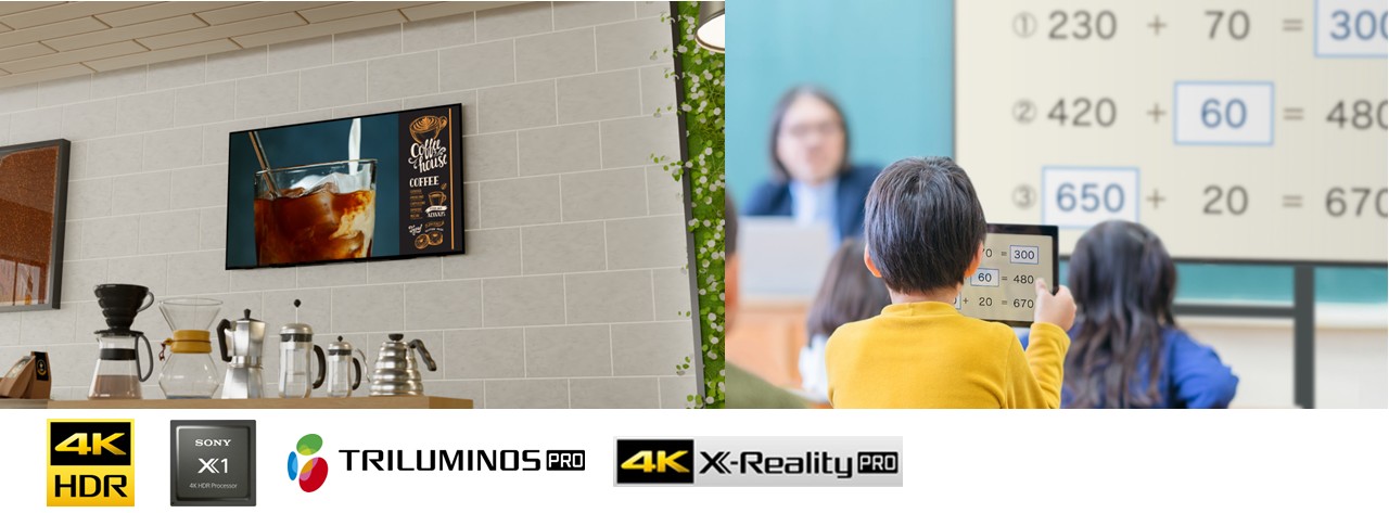 ソニー独自の高精細・高コントラスト・広色域技術に加え、550cd/m2の4Kパネルを搭載。明るい教室や会議室でも、資料・教材の数字やグラフ・図面などの細部まで高精細に表示することで、情報伝達を効率化します。またサイネージとして活用する場合は、見る人の視線や興味をひきつけ、商品やサービス情報をより魅力的に伝えます。